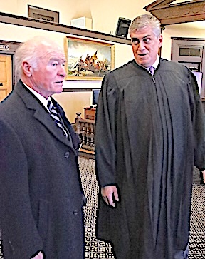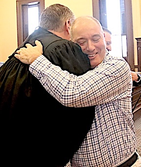 Left: Former Schuyler County Judge J.C. Argetsinger, left, and current County Judge Matt Hayden talked after the ceremony. Argetsinger swore in the last DA, Joe Fazzary, in 1998. Right: Former DA Joe Fazzary, right, hugs Judge Hayden, who served as Fazzary's Chief Assistant DA before being elected to the bench.