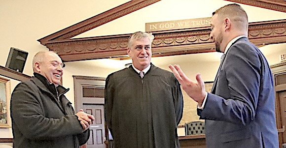 From left: Former District Attorney Joe Fazzary, County Judge Matt Hayden and new DA Jeremy Hourihan share a light-hearted moment in the county courtrooom.