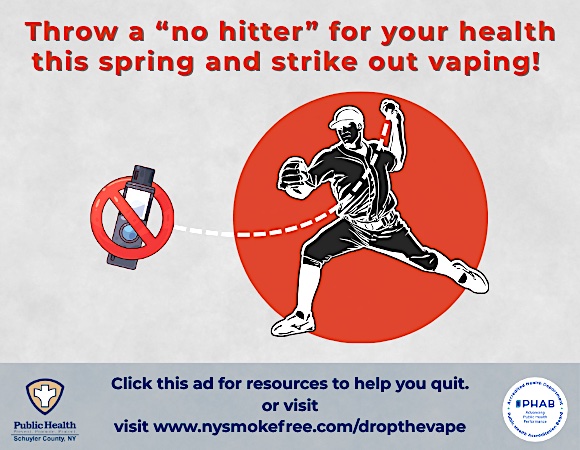 Teens and young adults in New York State who are trying to quit vaping or using nicotine pouches can access DropTheVape, a free and confidential texting program designed specifically for youth ages 13 to 24. DropTheVape sends participants skill-building texts to overcome the use of tobacco products. Get started at nysmokefree.com/drop-the-vape.
