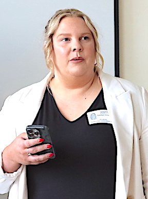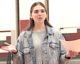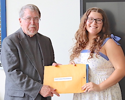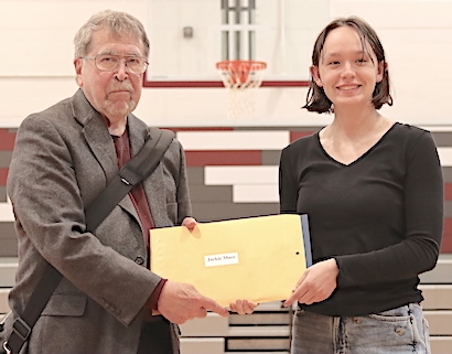 Each of the two presentation ceremonies -- in the Odessa-Montour High School's Jack Davis Gym and in the Watkins Glen High School library -- featured a guest speaker: 2023 O-M graduate and three-time Tribute Award honoree Hannah Nolan in the Davis Gym, and 2009 WGHS graduate and four-time Top Drawer 24 honoree Katey Cheplick in the Glen library. Nolan is a track athlete attending SUNY Cortland (and, now that school is out, substitute teaching in the O-M district), while Cheplick is an Associate Vice President for Technical Solutions and Systems (IT) at Keuka College. Speaking to audiences that included not only the honored students, but the students' parents as well, both Nolan and Cheplick offered congratulations for the achievements leading to this award. They told of their own experiences and imparted the message that the honorees will need to draw on those characteristics that have brought them this far -- in particular a strong work ethic, not to mention determination-- even more as they face the challenges and seize the opportunities ahead of them in life. After the ceremony, each was accessible to students and parents at a reception. This year's Odessa File Tribute 24 Award honorees, by school but in no particular order, are as follows. Photos in text: Speakers Hannah Nolan (at O-M, top) and Katey Cheplick (at WGHS). (Photos by Jon Haeffner) ********* O-M's Tribute Award Honorees:About each O-M honoree: Cara Reynolds: This year's O-M Valedictorian with a 98.26 GPA, she plans to attend SUNY Delhi with an eye on a career as a veterinarian. Co-President of the Senior Class, she is a member of the National Honor Society, Drama Club and the Superintendent's Student Advisory Council, and volunteers for the American Heritage Girls. She competes in track and was an Odessa File First Team All-Star in swimming after winning four races at the Section IV, Class C meet, helping her team to its eighth straight title. "She is someone who enjoys being part of the program," said her track coach, Skip Strobel. "She will take on any role to assist the team and can often be found cheering on her fellow throwers when not competing." Added her swim coach, Jason Westervelt, "Cara has an incredible work ethic in the pool and knows how to rise to the occasion." This is her second year on the Tribute 24 Award team.