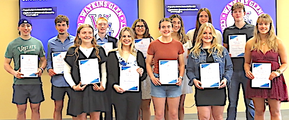 Jared Watson: A sophomore with a 98.72 GPA, he competes on the varsity football, wrestling and track & field teams, and is on the school's Student Advisory Committee. A member of the Montour Methodist Church and the Odessa Conservation Club, he says of his career goals: "I want to learn taxidermy on the side and get a job welding while coaching wrestling." Says his football coach, Trevor Holland: "One of the most team-oriented players I have ever coached. An excellent role model of hard work." Added his track coach, Skip Strobel: "Jared is a student of his sport, does anything he can to make himself better, always wanting to learn and improve. I'm looking forward to having him another couple of years." And from his wrestling coach, Dan Batchelder: "Jared is a young man who has the leadership skills of a seasoned commander. He is also an individual who completely understands the concept of teamwork and how individuals should work to their full potential to support the needs of a group. Jared is a great example for other students to follow." Photos in text above: From the top, honorees Sarah Strobel, Jackie Mace, Leah Antes, Lucas Barr and Evvie Zinger with Odessa File Editor and Publisher Charlie Haeffner. He handed each honoree a packet containing Certificates of Recognition or Achievement from The Odessa File, Schuyler County Administrator Shawn Rosno, State Assemblyman Phil Palmesano, State Senator Tom O'Mara and Congressman Nick Langworthy. (Photos by Jon Haeffner) ********* The Odessa-Montour honorees:From left: Jackie Mace, Gavin Lohmeyer and Riley Brooks. From left: Rilke Arrance, Lucas Barr and Cara Reynolds. From left: Jared Watson, Evvie Zinger and Jed Lynch. From left: Leah Antes, Connor Foggie and Sarah Strobel. ******* The Watkins Glen honorees:From left: Brianna Hatch, Sam Hohle and Zade Gomez-Fitzsimmons. From left: Carson Thaete, Emily Melveney and Kendra Fish. From left: Natalee Oliver, Olivia VanSkiver and Sam Caslin. From left: Skye Honrath, Nick D'Alleva and Rachel Vickio. ******* About each WGHS honoree:Skye Honrath: A senior with a 4.01 GPA, she was a Tribute 24 Award honoree in her sophomore and junior years, too. An All-State soccer player, she led WGHS to a 12-4 record this year while setting the school career goal record (93). She also shares the single-season mark of 33, attained in her junior year. A member of the National Honor Society, she volunteers at the Bethany Village nursing home and with Seneca Santa. She plans to attend Binghamton University with an eye toward Pre-Med in the field of Pathology. She has been praised by her soccer coach, Scott Morse, as "a phenomenal athlete who displays the utmost in sportsmanship and class on the field. She led the team in scoring every year on varsity. Her skill and technique make her one of the best goal scorers in school history."
