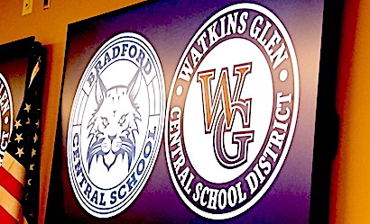 The process of consolidation is a long one, involving a merger study by an independent expert, votes by both boards and -- historically more challenging -- both an advisory vote by district residents which, if approved, would lead to a formal referendum of residents. Watkins School Board President Keith Caslin weighed in about discussing consolidation: "I think we have to," he said. "We have to think outside the box." One question raised was the status -- should a Watkins-Bradford consolidation reach fruition -- of existing merger agreements between the Watkins Glen and Odessa-Montour districts in various sports. The two districts have combined squads in football, swimming, baseball and softball. "We have no intention," said D'Alleva, "of not continuing our relationship with Odessa-Montour in shared athletics" -- O-M being a district that has historically opposed any district-wide consolidation. Nor did he have an answer to the future of the merged athletic programs in effect between the Bradford and Dundee school districts should a Watkins-Bradford consolidation occur. "We don't know the direction this is going to go," said D'Alleva. "There's nothing official. It's a long process -- a complex process driven by statute. The goal is to maintain program while reducing the local burden." Photos in text: Top: Logos of the Bradford and Watkins Glen School Districts as displayed during the Watkins School Board meeting.