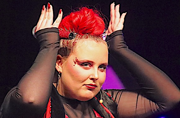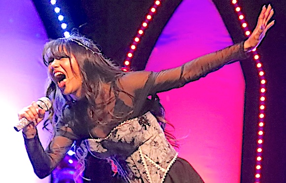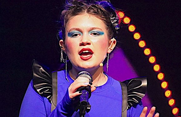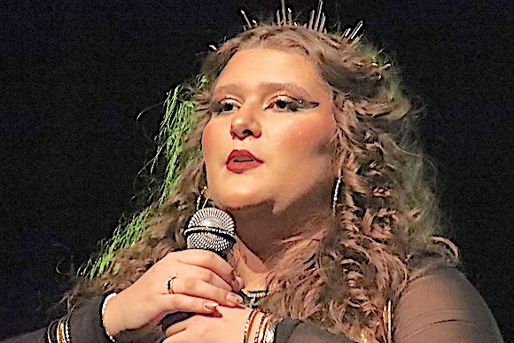 Left: Instrumentalist Elizabeth Fitzwater performs "Tainted Love." Right: Lilac Cruz sings "Headlock."