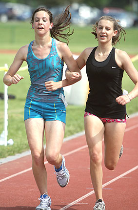 Liz Stamp at the finish line, Amelia Stamp (left) and Amber Swartz, Abby