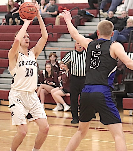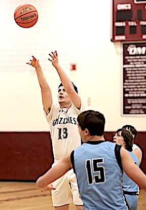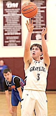 O-M missed a pair with 2:08 remaining, and then C-S sank a pair at 1:58 to go up 50-47. O-M missed two more at 1:49 before Campbell hit a 2-pointer to go up five, 52-47, at 1:26. Three more free throws increased the C-S lead to 55-47 by 46.2. From there, O-M hit 5-of-6 foul shots and Campbell 2-of-4 for a 57-52 score. A Moe Zinger 3-pointer at the buzzer left the Grizzlies short, 57-55. Mowry and Aaron Sutton led O-M scorers with 15 points each, while Kayden Garrabrant and Zinger had 7 each, James Halpin 6, Mason Dupay 3, and Connor Foggie 2. The team sank 13 of 29 free throws. Campbell-Savona was led by Dakota Ogden's 20 points, and 12 by Rece Jamison. Their team sank 19 of 32 free throws. Odessa-Montour returns to action Tuesday night at home against Candor. Junior Varsity: Odessa-Montour defeated Campbell-Savona, 43-32. Mason Smith led the Grizzlies with 16 points, while Ethan Dupay scored 10 and Jeremy Updyke 8. Photos in text: O-M's Moe Zinger (top) and James Halpin (bottom) take aim.
