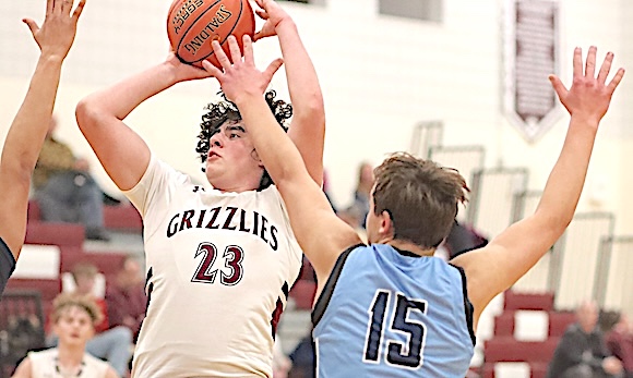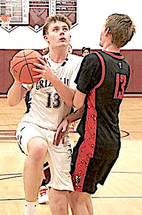 Left: O-M's Kayden Garrabrant (13) drives to the hoop. Right: The Grizzlies' Aaron Sutton (foreground) is fouled as he shoots.