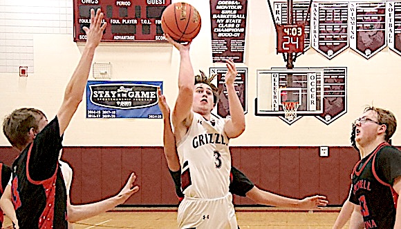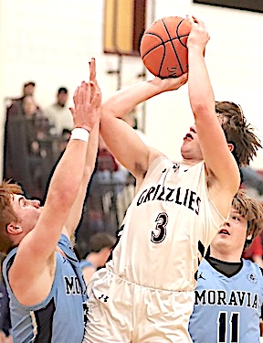 The Grizzlies trailed 20-12 after one quarter, 35-28 at halftime, and 49-34 entering the fourth period. Aaron Sutton led O-M in scoring with 14 points, while Connor Foggie scored 8, Kayden Garrabrant 7, Moe Zinger 5, and Hunter Mowry 2. The team sank 1 of 5 free throws. Moravia sank 8 of 15. The Grizzlies return to action Monday at home against Campbell-Savona. ******* Photo in text: Odessa-Montour's Connor Foggie (12) takes aim at the basket. Junior Varsity: Odessa-Montour defeated Moravia, 49-44. Mason Smith led the Grizzlies with 16 points, while Jeremy Updyke scored 14, Ethan DuPay 11, and Carson Bates 7.