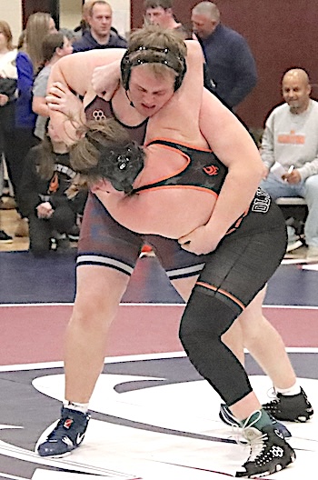 Ithaca won the tournament over Whitney Point based on tie-breaker criteria. Thomas Edison and Dundee also participated in the tournament. Four OM/WG wrestlers were awarded Most Outstanding Wrestler awards in their weight classes for finishing the tournament undefeated. Nicky Sorce (118 pounds), Daniel Coston (144 pounds), Jared Watson (175 pounds), and Patrick Croft (215 pounds) all finished with 5-0 records and MOW distinction. Declan Barry (285 pounds) also finished 5-0 but lost MOW recognition to Dundee's Caleb Bartlett on tie-breaker criteria (Most Pinfall Victories). Lucas Hoffman (126/132 pounds) finished the tournament with a 4-1 record. Isaac Rumsey (126/132 pounds) and Jotham Lynch (150/157 pounds) each earned three victories, while Wessly Haus (110 pounds), Dalton Smith (126/132 pounds), and Hunter Barrett (150/157 pounds) earned two victories apiece. Caden Hall (103 pounds), Dylan Senecal (138 pounds), Ethan Hornbrook (157 pounds), Emmitt Presutti (165 pounds), and Jett Starkweather (190 pounds) earned one victory each. OM/WG wrestlers return to action on Wednesday, January 7th when they take on Lansing in O-M's Jack Davis Gym. Wrestling is scheduled to begin at 6:30 p.m. Photo in text: The Storm's Declan Barry on the way to victory at 285 pounds against a Marathon opponent. Barry was 5-0 in the tourney.