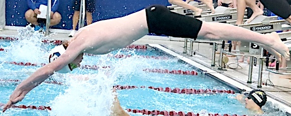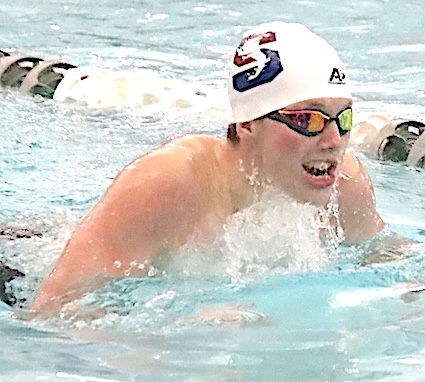 "The boys swam an outstanding meet today," said Storm Coach Jason Westervelt about his squad. "We had some fantastic mid-season time drops and amazing finishes." Top finishes for the Storm included the following: 200 Medley Relay: 3rd, Ryan Dean, Grayson Robertson, Carson Thaete, Alex Walters. Photo in text: The Schuyler Storm's Ryan Dean competes in the final of the 200 IM.