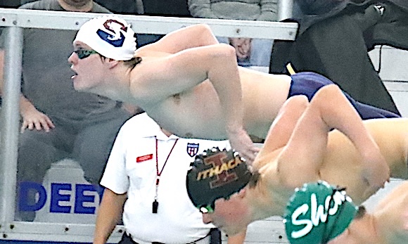 The Schuyler Storm's Carson Thaete flies high on the 200 Free dive. He placed fifth. M-E wins Glen Invitational; Storm is 4th WATKINS GLEN, Jan. 3, 2026 -- The Schuyler Storm boys varsity swim team placed 4th Saturday among the 10 high school teams competing in the annual Invitational in the Glen at Watkins Glen High School.