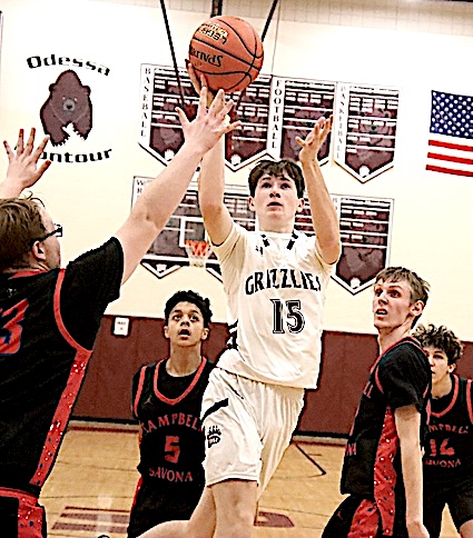 Left: O-M's Kayden Garrabrant shoots. Right: The Grizzlies' Moe Zinger maneuvers past an Edison defender. Odessa boys lose to Edison, slip to 0-4