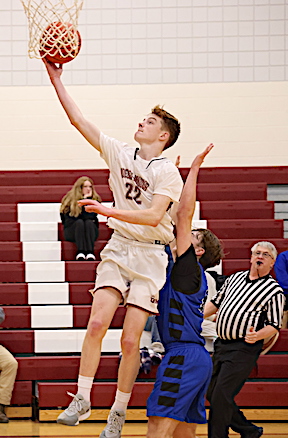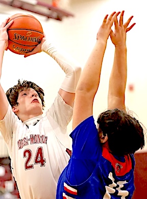 Left: O-M's Kayden Garrabrant attempts a shot while closely guarded. Right: In the JV game, Mason Smith drives to the hoop. (Photo by Gail Sgrecci)