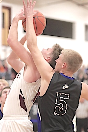 Left: O-M's Aaron Sutton tries to work his way past an Edison player. Right: In the JV game, Jeremy Updyke goes up for a shot. He scored 15 points.