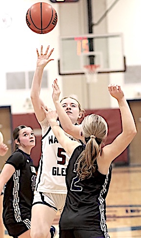 Left: O-M's Vanessa Wood eyes a shot in traffic. Right: The Grizzlies' Brooklynn Thompson takes aim at the basket.
