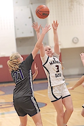 Left: Watkins Glen's Michaela Wheaton shoots. Right: In the JV game, Michaela's sister McKenzie Wheaton puts up a shot.