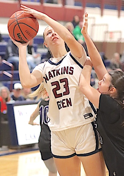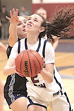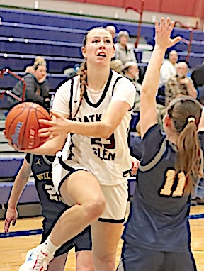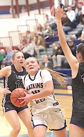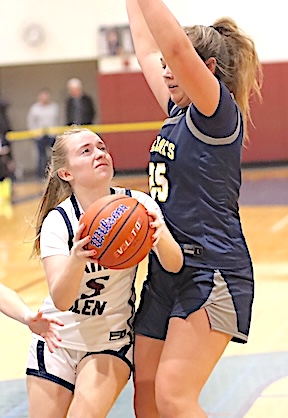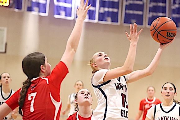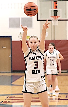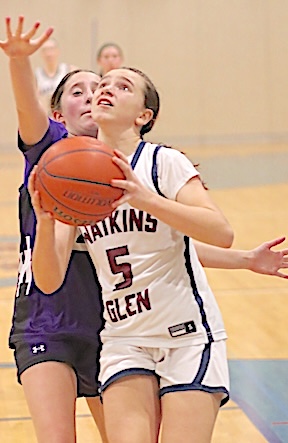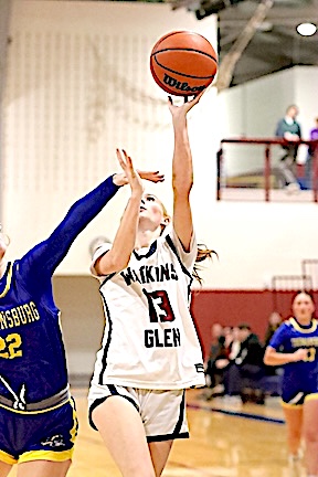 The Lake Hawks led 19-7 after one period, 36-14 at halftime, and 47-17 entering the fourth quarter. Michaela Wheaton and Olivia King led Watkins scorers with 13 points each, while Rachel Vickio scored 10, Emma Lewis 8, Lizzi Fitzwater 3, and Isabella Bellavigna, Grace Roney, Natalee Oliver and Zade Gomez Fitzsimmns 2 apiece. Oliver, King and Aubrey Klemann led in rebounds with 5 each, while Vickio and Bellavigna grabbed 4 apiece, and Wheaton, Fitzwater and Gomez Fitzsimmons 3 each. King led in steals with 5, Vickio in blocks with 2, and Oliver in assists with 5. Junior Varsity: Watkins Glen defeated Dryden, 45-35, to improve to 5-2. Allyson Oliver led Lake Hawks scorers with 12 points, while Keira Ells scored 10 and Amy Field 9. Photo in text: Watkins Glen's Olivia King prepares to shoot in traffic.