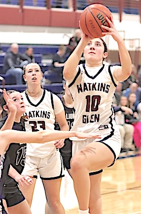 Left: Watkins Glen's Rachel Vickio shoots for two of her eight points. Right: The Lake Hawks' Emma Cady delivers a lay-up. Watkins girls defeat Trumansburg, 46-32