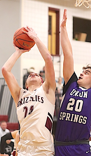 The Grizzlies trailed 23-6 after one period, 50-13 at halftime, and 68-32 entering the fourth quarter. Aaron Sutton led O-M with 11 points, while Hunter Mowry scored 6, James Halpin 6, Kayden Garrabrant 4, Caleb Malnoske 3, Jaden Bailor 3, Moe Zinger 2, Mason DuPay 2, and Jacob Carnes 2. The team converted 3 of 5 free throws. Union Springs was led by Rocco Testa's 26 points. His team sank 10 of 18 free throws. Junior Varsity: Odessa-Montour lost to Union Springs, 66-28. Jeremy Updyke led the Grizzlies with 9 points. ******** Photo at right: Odessa-Montour's James Halpin prepares to shoot while heavily guarded by Union Springs' Orion Rusinko.