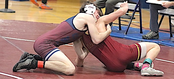 WG/OM's Jared Watson (top) on the way to victory at 175 pounds. He won by fall.
