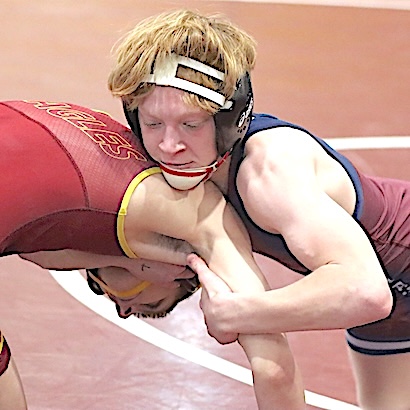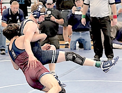 The Schuyler Storm's Daniel Coston, left, en route to victory in a 144-pound match. He placed fourth in his weight class.