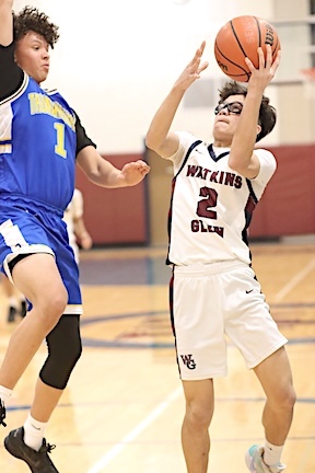 The Lake Hawks were led by Jude Santos, who scored 19 points and grabbed 14 rebounds. Other points came from Caleb Bresett (11). Bryce Bockelkamp (6, with 7 rebounds), Leon Lagramada (4), Dominic Lewis (4), Caydin Lagramada (3), Jax Decker (3), Christopher Simiele (2), and Jaydon Scholtisek (2). "Not our best effort tonight," said Watkins Glen Coach Scott Morse. "We looked slow and lacking in energy throughout. The defensive intensity we have been bringing each game just wasn't there tonight and we couldn't hit a shot to save our lives. We were 9 for 21 from the free throw line, 2 for 17 from the three-point line and missed too many layups to count. That's sports, though. Some nights you just struggle, but I know how good this team is and can be, and we won't hang our heads for long. "Win or lose I'm immensely proud of these young men and I know they will show up to practice tomorrow focused and ready because they are such a committed and hard-working group. We have an important game at Lansing on Friday night, so we need to be ready to play a very good team on the road." Junior Varsity: Watkins Glen (1-12) lost to Trumansburg 42-22.Noah Wright led the Lake Hawks with 10 points and 6 rebounds. Photo in text: Watkins Glen's Dominic Lewis prepares to shoot in traffic.