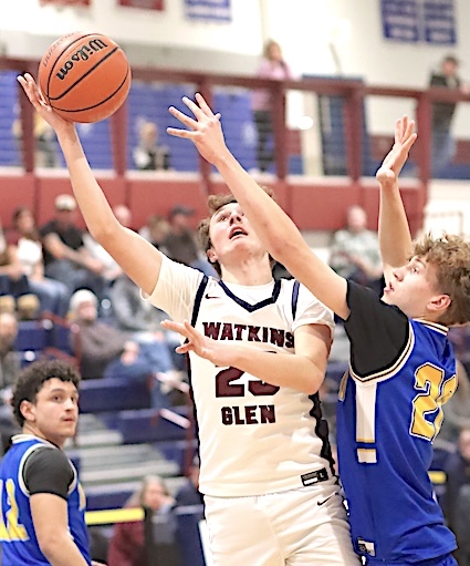 Junior Varsity: Watkins Glen (1-8) lost to Newark Valley 63-23. Nicolai Holmes led the Lake Hawks with 9 points and 5 rebounds. ******** Photos in text: Top: Watkins Glen's Christopher Simiele scores two of his 22 points. Odessa-Montour girls fall to S-VE, 31-21