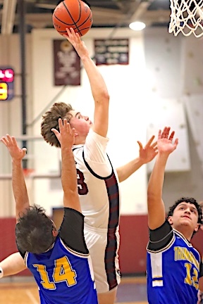 Junior Varsity: Watkins Glen fell to 1-10 with a 51-32 loss to Lansing. Nicolai Holmes scored 10 points, Noah Wright 9 points and Cooper Lagramada 8. Wright led in rebounds with 12. ***** Photos in text: Top: Watkins Glen's Jude Santos (13) drives to the hoop against Lansing's Jackson Tarbert. Santos was fouled on the play. Bottom: The Lake Hawks' Christopher Simiele prepares to shoot in traffic.