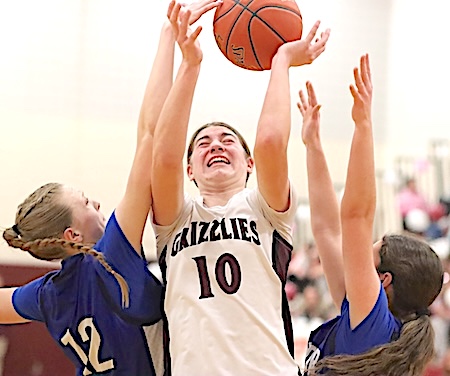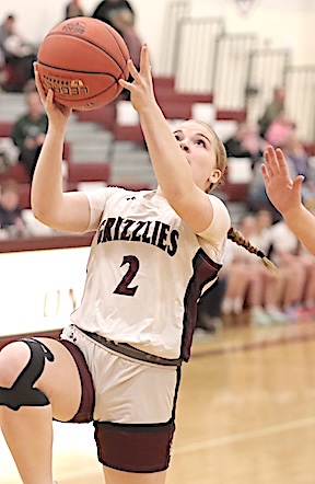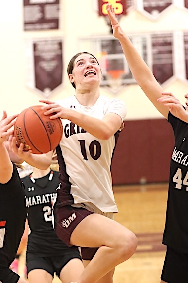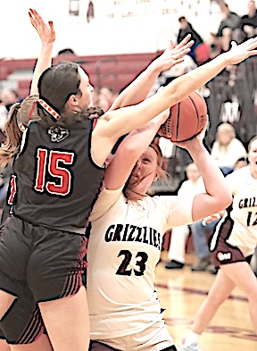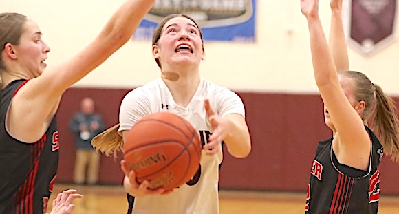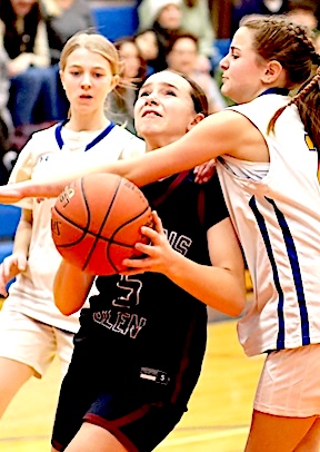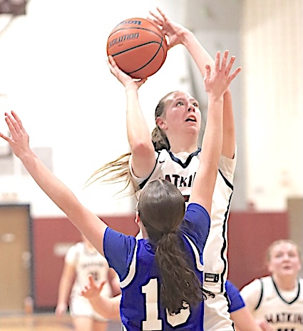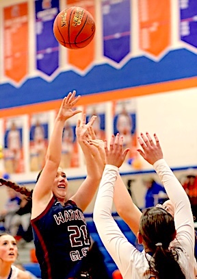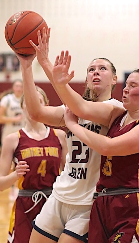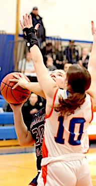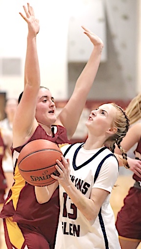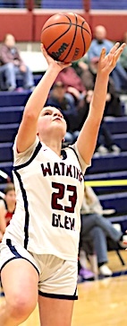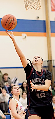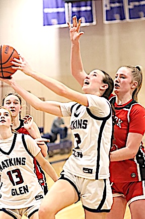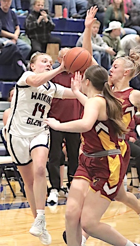 Left: Watkins Glen's Keira Ells is fouled as she drives to the basket. Right: The Lake Hawks' Amy Field shoots for two of her 18 points.