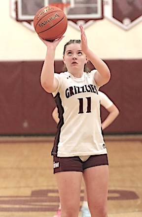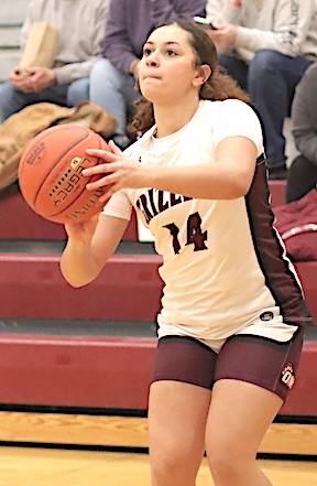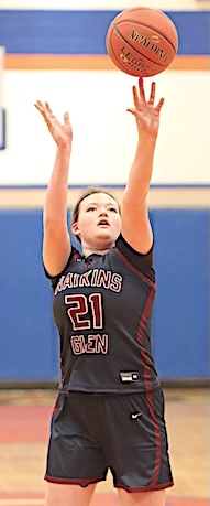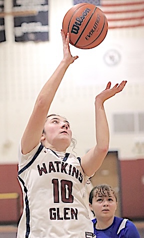 Left: Watkins Glen's Michaela Wheaton prepares to shoot. Right: The Lake Hawks' Emma Cady sends a shot that found the net for two points.