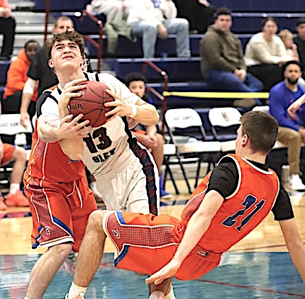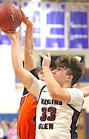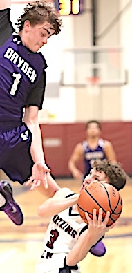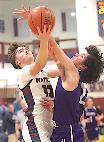 Top: Watkins Glen's Christopher Simiele goes airborne on his way to the basket.