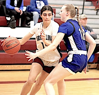 Photo in text: Watkins Glen's Rachel Vickio drives to the hoop for two points.