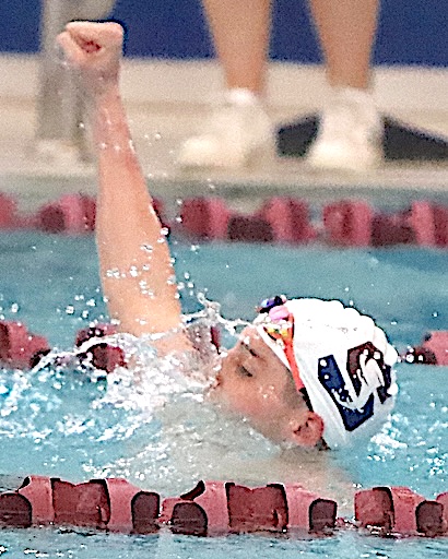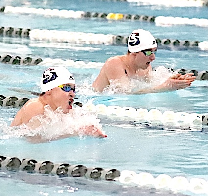 Left: The Storm's Ryan Dean on the way to third place in the 200 Individual Medley. He won the 100 Back, and was on two winning relay squads. Right: Alex Walters, left, and Carson Thaete hold the Seciton IV, Class C championship plaque.