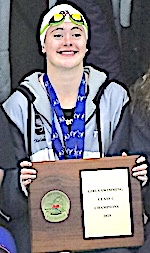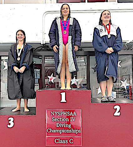 Dechow came in first place with an 11-dive score of 320.2, which is the new Storm record (such records kept since the Watkins Glen and Odessa-Montour high school swim programs merged). She also set the new Storm six-dive record with a score of 182.9 after her first half-dozen dives. Both scores broke her own Storm marks (which were 285.60 and 176.50, both set this year, it being her first).. She also won the Interscholastic Athletic Conference title last month. Hines came in second Friday with a personal best 11-dive score of 310.8, which also broke the previous Storm record. "They scored the first points of sectionals," said their coach, Emily Hoffman, "leading the Storm into Saturday with a 37-point lead!" The swim portion of the Section IV, Class C Tournament takes place Saturday in the WGHS pool. Dechow also qualified for the Amateur Athletic Union national championship in San Antonio, Texas in July. Photo in text: Saskia Dechow atop the podium, with runnerup Casey Hines at her side. (Photo provided) XC: O-M's Anderson qualifies for States