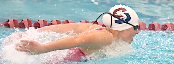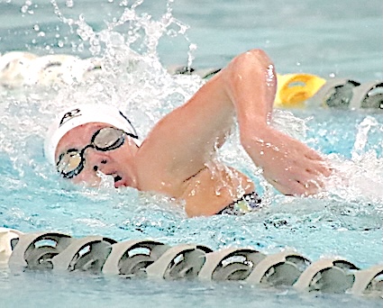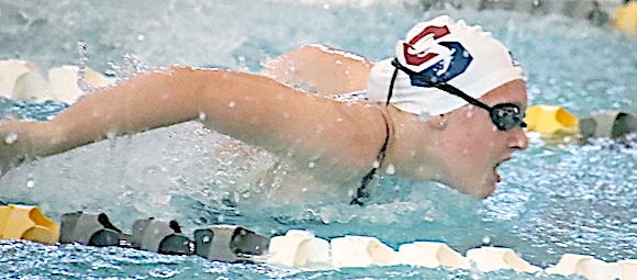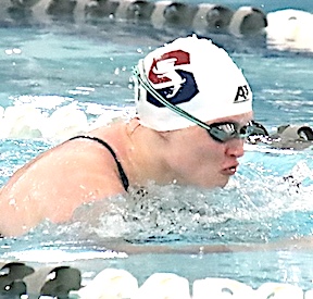 Storm swimmers claiming berths in the eight-person finals were: -- Makenzie Fish, Lizzi Fitzwater, Emily Melveney and Aubrey Klemann, 1st in the 200 Medley Relay (1:59.63) Lydia Schubmehl in the 200 Free and 100 Breaststroke, Willow Deragon in the 200 IM and 500 Free, Brie Blauvelt in the 50 Free and 100 Back, Ellie Bacon in the 100 Free and 100 Back, Eliza Van Ness in the 200 IM and 100 Fly, Rowen Stegner in the 100 Fly and 100 Back, Lizzi Fitzwater in the 100 Free, Wendy Coleman in the 200 Free, and Kaylin Smith in the 200 IM. Photos in text: Top: The Storm's Makenzie Fish enroute to second place in the 200 IM prelim.