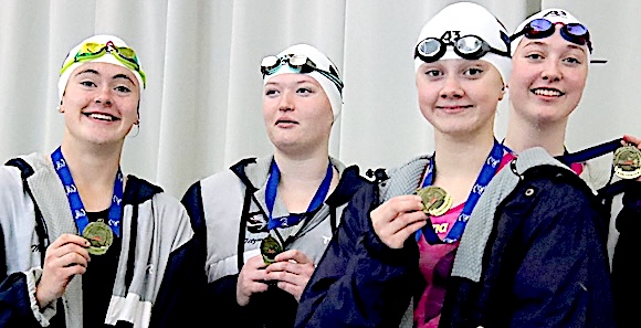 The Storm's winning 200 Medley Relay squad on the podiium. From left: Emily Melveney, Lizzi Fitzwater, Makenzie Fish and Aubrey Klemann.
