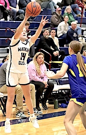 Left: Watkins Glen's Rachel Vickio shoots. Right: In the JV game, the Lake Hawks' Amelie Woods takes aim at the basket.