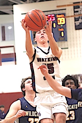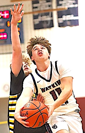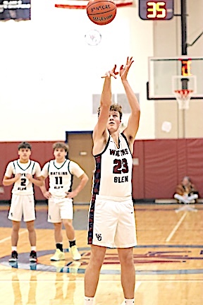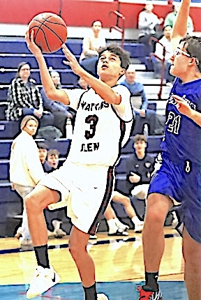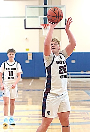 In the Consolation Game, South Seneca defeated Spencer-Van Etten, 74-33. Junior Varsity: Watkins Glen fell to Spencer-Van Etten 33-30 in the tourney's Junior Varsity Consolation Game. The Lake Hawks, now 0-6, rallied from a 32-18 deficit but could not quite overtake S-VE. Cooper Lagramada led Watkins with 17 points, while Noah Wright scored 6, Nicolai Holmes 5, and Dominik Thomson 2. Wright and Holmes each grabbed 10 rebounds. Marcus Whitman defeated Romulus for the JV title. Photos in text: Top: The Lake Hawks' Leon Lagramada takes aim at the basket.
