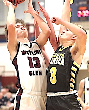 Junior Varsity: Watkins Glen fell to Romulus 39-30 in the opening round of the tourney's JV competition, and will play Sunday in the 12:00 noon Consolation Game against Spencer-Van Ettten. Romulus and Marcus Whitman will play for the JV title at 1:30. The Lake Hawks, now 0-5, were led by 11 points each from Noah Wright and Cooper Lagramada. Wright led in rebounds with 13, while Nicolai Holmes registered 6 points, 7 rebounds and 4 steals. Photos in text: Top: Watkins Gleen's Caleb Bresett drives to the basket in traffic.