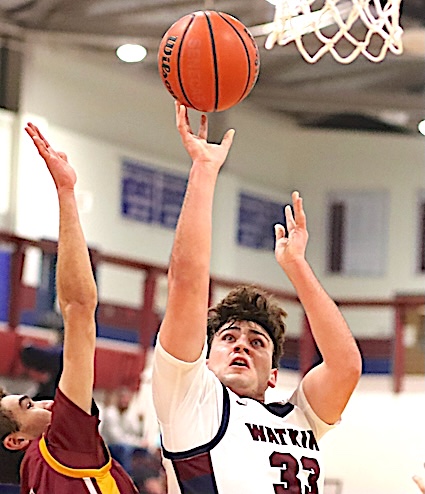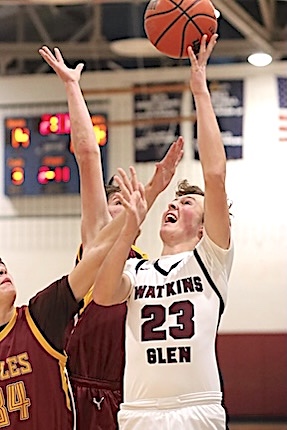 Junior Varsity: Watkins Glen (1-8) lost to Newark Valley 63-23. Nicolai Holmes led the Lake Hawks with 9 points and 5 rebounds. ******** Photos in text: Top: Watkins Glen's Christopher Simiele scores two of his 22 points. Odessa-Montour girls fall to S-VE, 31-21