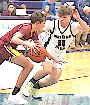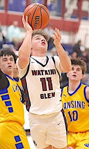 Junior Varsity: Watkins Glen fell to 1-10 with a 51-32 loss to Lansing. Nicolai Holmes scored 10 points, Noah Wright 9 points and Cooper Lagramada 8. Wright led in rebounds with 12. ***** Photos in text: Top: Watkins Glen's Jude Santos (13) drives to the hoop against Lansing's Jackson Tarbert. Santos was fouled on the play. Bottom: The Lake Hawks' Christopher Simiele prepares to shoot in traffic.