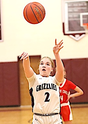 Left: O-M's Reese Rounds shoots. Right: The Grizzlies' Aspyn Skinner takes aim. O-M girls JV team falls to S. Seneca