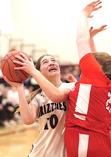 The Grizzlies built an 18-8 first-half lead as Southern Cayuga failed to sink a field goal before intermission, amassing its eight points at the foul line. O-M led 26-19 after three quarters, saw its lead shrink to three points at 27-24, and then held on down the stretch. Leah Antes led O-M with 18 points, 16 rebounds and 7 steals. Other points came from Vanessa Wood (5, with 6 rebounds), Olivia Rivera (4), Olivia Barr (3), Jaden Jarrell (2), and Brooklynn Thompson (1). The team converted 11 of 24 free throws. Southern Cayuga sank 12 of 20. "We were lucky to escape with a win tonight," said O-M Coach Greg Gavich. "Fortunately our defensive energy was good enough to carry us to the win. I wish we could have put together a little smoother performance on the offensive end. "Our student body and crowd," he added, "were fantastic tonight -- a great atmosphere." Junior Varsity: Odessa-Montour lost to Southern Cayuga, 21-18. Photo in text; O-M's Leah Antes looks for a shot in traffic.