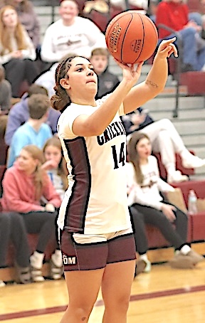 Left: O-M's Vanessa Wood takes aim on the foul line. Right: The Grizzlies' Olivia Rivera shoots from the corner. O-M girls top Southern Cayuga, 33-28