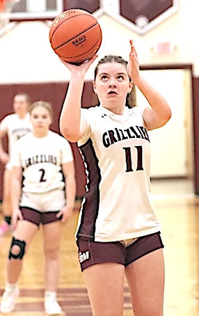 Left: O-M's Jaden Jarrell shoots a free throw. Right: The Grizzlies' Olivia Barr prepares to shoot from 3-point range.