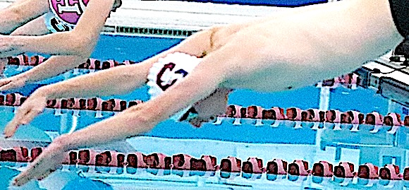 The Storm's Makenzie Fish at start of the 100 Backstroke, which she won. Storm swimmers fall to Southern Cayuga
