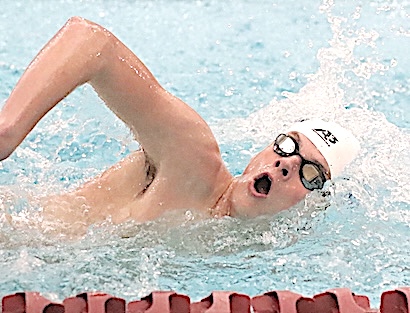 The Storm, a combined squad of WGHS and Odessa-Montour High School athletes, won the following events: 200 Medley Relay: 1st, Evan Clarkson, Andre Wixson, Hudson Westervelt, Grayson Robertson, 1:54.31. Photos in text: Top: The Storm's David Heichel competes in the 200 Free.