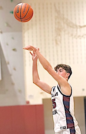 Left: Watkins Glen's Caleb Bresett shoots from long range. Right: The Lake Hawks' Jax Decker takes aim at the basket. Watkins boys defeat Newark Valley