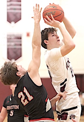 The Grizzlies, down 29-20 at halftime, were within seven points at 34-27 when Groton went on a 15-0 run, clinching the victory. Aaron Sutton led O-M with 10 points, while Kayden Garrabrant scored 9, Connor Foggie 6, Moe Zinger 4, Caleb Malnoske 2, and James Halpin 2. The team converted 5 of 10 free throws. Groton, now 5-5, was led by Kameron McClain's 24 points, and 22 by Jerome Turner. The team sank 8 of 14 free throws. Junior Varsity: Groton defeated Odessa-Montour, 59-43. Jeremy Updyke led the Grizzlies with 17 points, while Mason Smith scored 14. Photo in text: O-M's Kayden Garrabrant goes up for a shot.