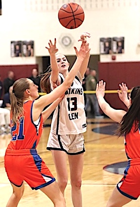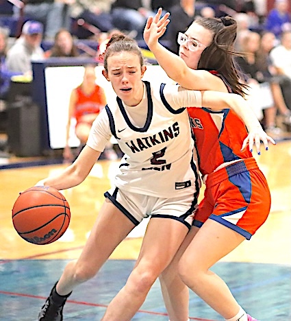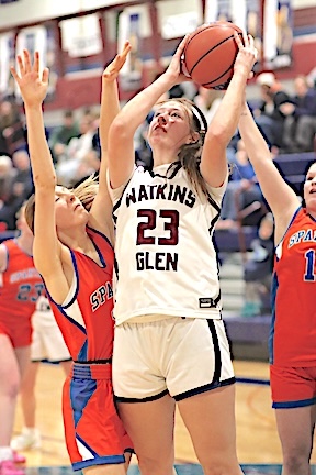 The Lake Hawks led 19-7 after one period, 36-14 at halftime, and 47-17 entering the fourth quarter. Michaela Wheaton and Olivia King led Watkins scorers with 13 points each, while Rachel Vickio scored 10, Emma Lewis 8, Lizzi Fitzwater 3, and Isabella Bellavigna, Grace Roney, Natalee Oliver and Zade Gomez Fitzsimmns 2 apiece. Oliver, King and Aubrey Klemann led in rebounds with 5 each, while Vickio and Bellavigna grabbed 4 apiece, and Wheaton, Fitzwater and Gomez Fitzsimmons 3 each. King led in steals with 5, Vickio in blocks with 2, and Oliver in assists with 5. Junior Varsity: Watkins Glen defeated Dryden, 45-35, to improve to 5-2. Allyson Oliver led Lake Hawks scorers with 12 points, while Keira Ells scored 10 and Amy Field 9. Photo in text: Watkins Glen's Olivia King prepares to shoot in traffic.