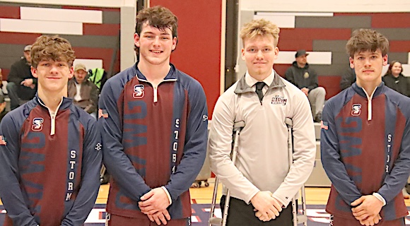 The Odessa-Montour senior members of the Schuyler Storm varsity wrestling team were honored in a pre-meet Senior Night ceremony. From left, they are Lucas Hoffman, Patrick Croft, Ean Walsh and Dylan Senecal.